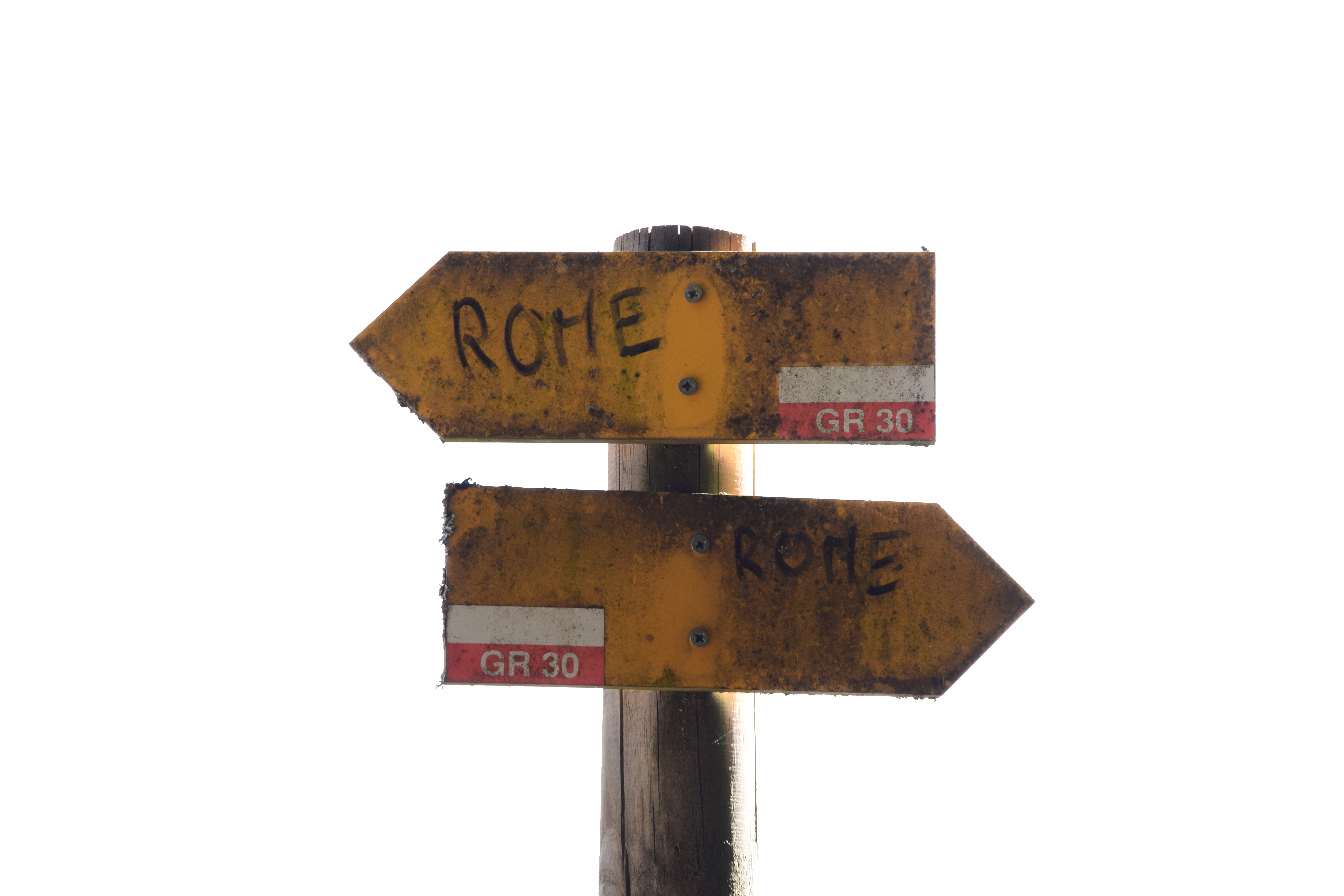 De retour de la Banne, nous nous dirigeons vers le Puy Gros. Hélas, nous nous perdons, la faute à un poteau de bois détruit et un trait vert dissimulé sur un rocher perdu dans les hautes herbes. Alors que nous descendons la lande et commençons à emprunter les bois, inquiets, nous trouvons enfin un panneau. Celui ci nous indique que tous les chemins mènent à Rome. Nous décidons, après une concertation de deux heures, de nous rendre à Rome.