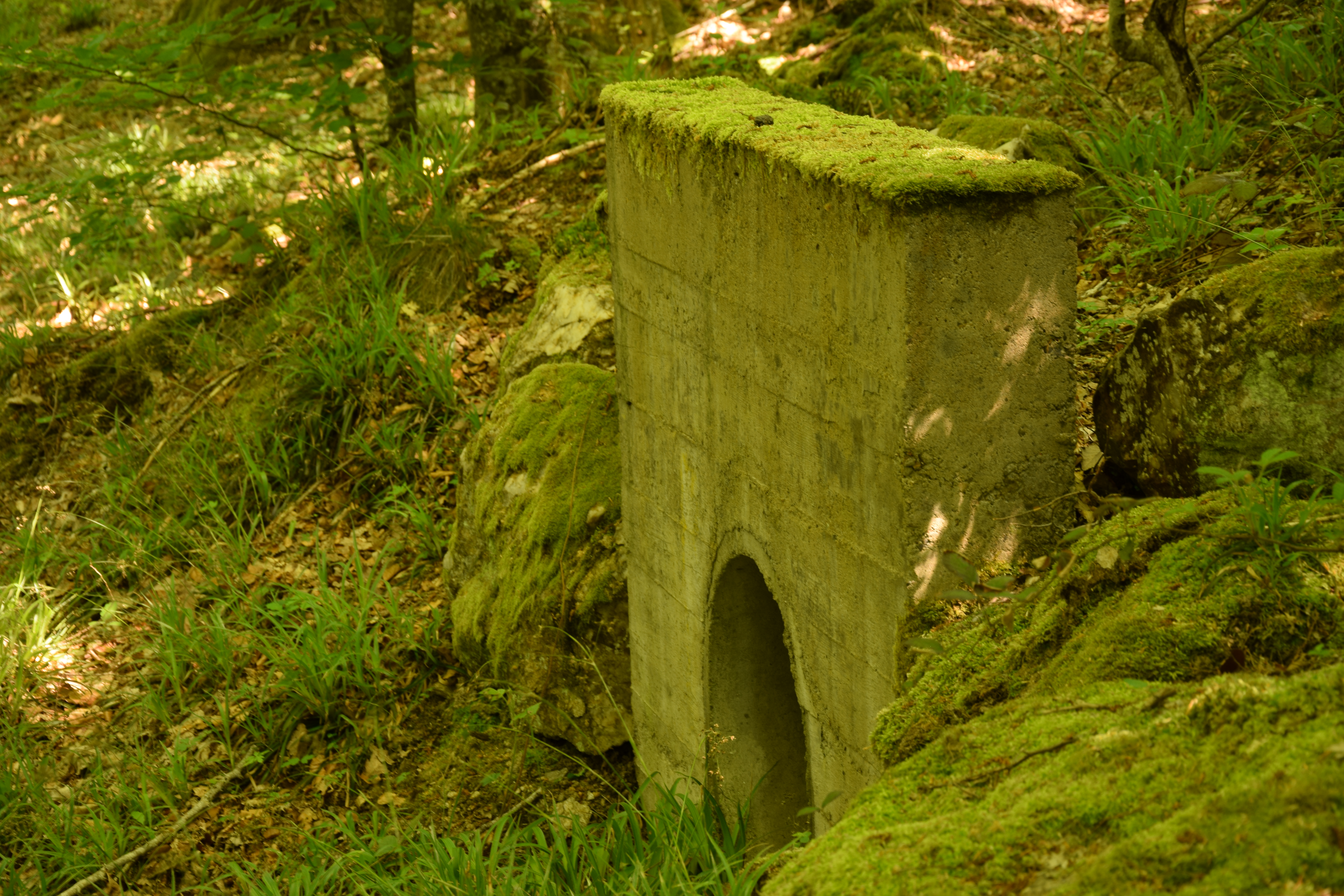 Nous tergiversons, ne savons que faire. Finalement, après concertation, nous décidons de prendre un itinéraire plus sûr en nous enfonçant dans les bois. Après voir manqué de nous noyer dans un ruisseau, de nous faire dévorer par les tiques et d’arracher la moitié de nos pantalons dans des ronces, nous retombons sur un signe de la civilisation. Pas de balise, mais une architecture ancestrale et captivante.