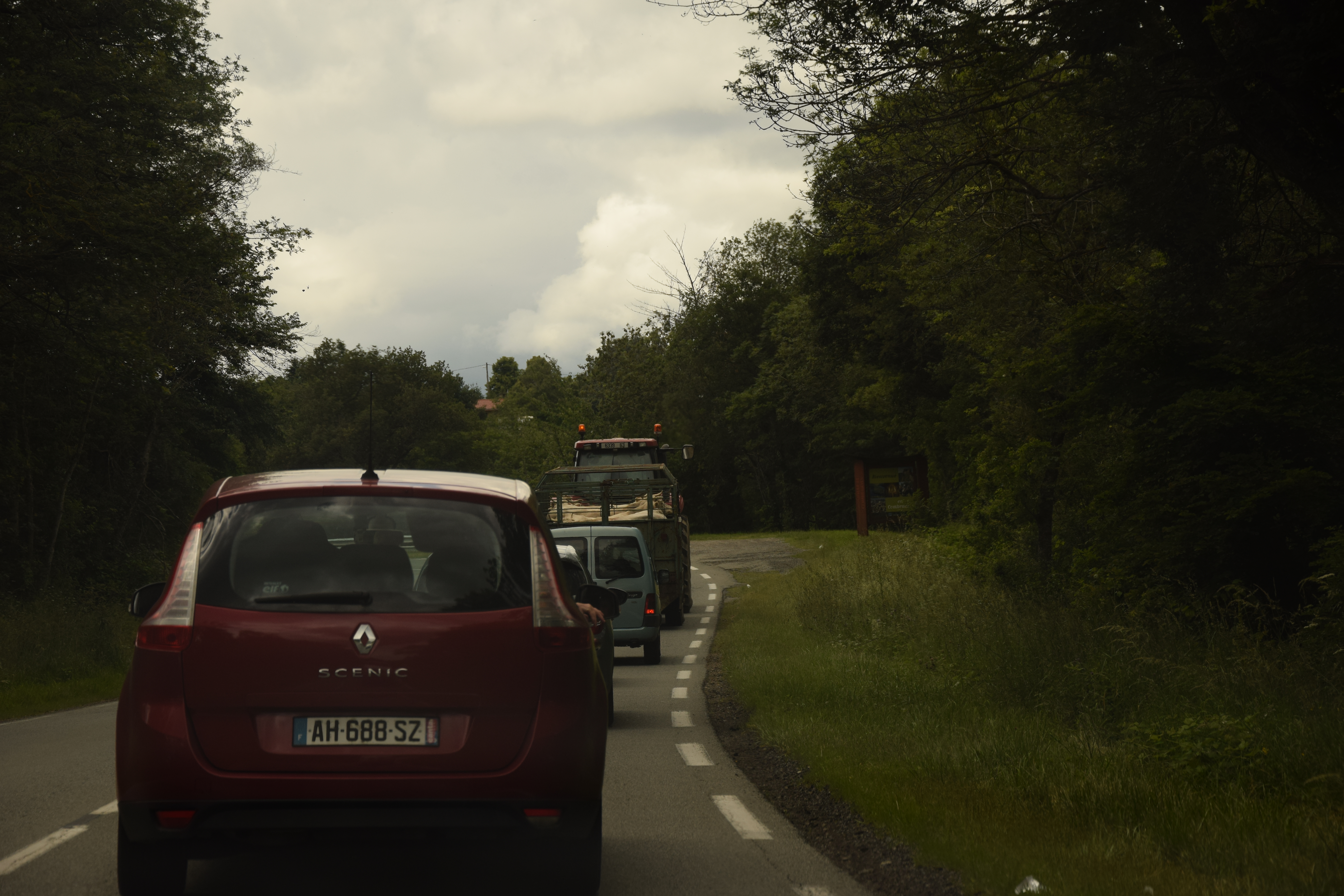 Quand on part faire une balade, on ne se pose pas généralement la question du trajet. Alors que le début du trajet se déroule comme prévu, tout se gâte dès Riom ! 20 min pour essayer de sortir de la ville ! La route vers Volvic est en travaux, le panneau indiquant Châtel Guyon est recouvert de scotch, la route de secours vers Maringues est bloquée pour cause de brocante et le contournement mène à un rond-point barré pour cause de course cycliste ! La ville de la poubelle et du stationnement payant abusif a plus d’un tour dans son sac ! Heureusement, nous parvenons à nous extirper de cet enfer, fonçons comme des bolides en direction des Combrailles, et dès que nous y entrons… misère… Un tracteur !