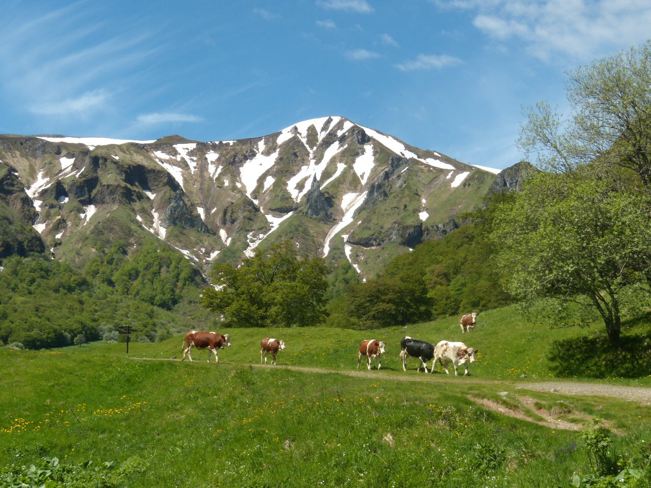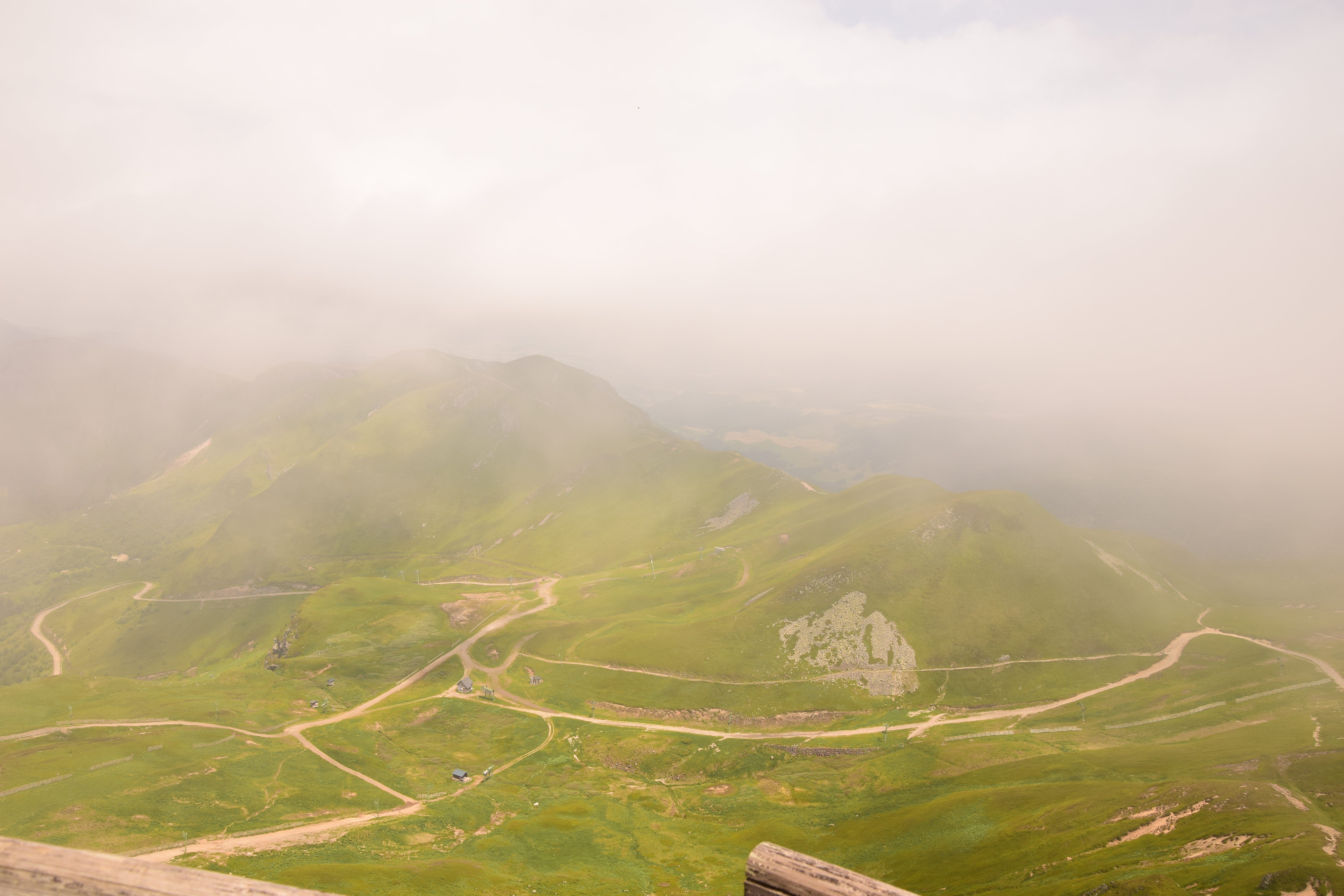 Nous allons désormais faire tout le tour de la vallée en grimpant sur les crêtes et en faisant un petit détour au sommet du Sancy. L’arrivée aux premières éminences est somptueuse. Seules quelques édifications modernes viennent perturber la nature verdoyante. La vue est de toute beauté.