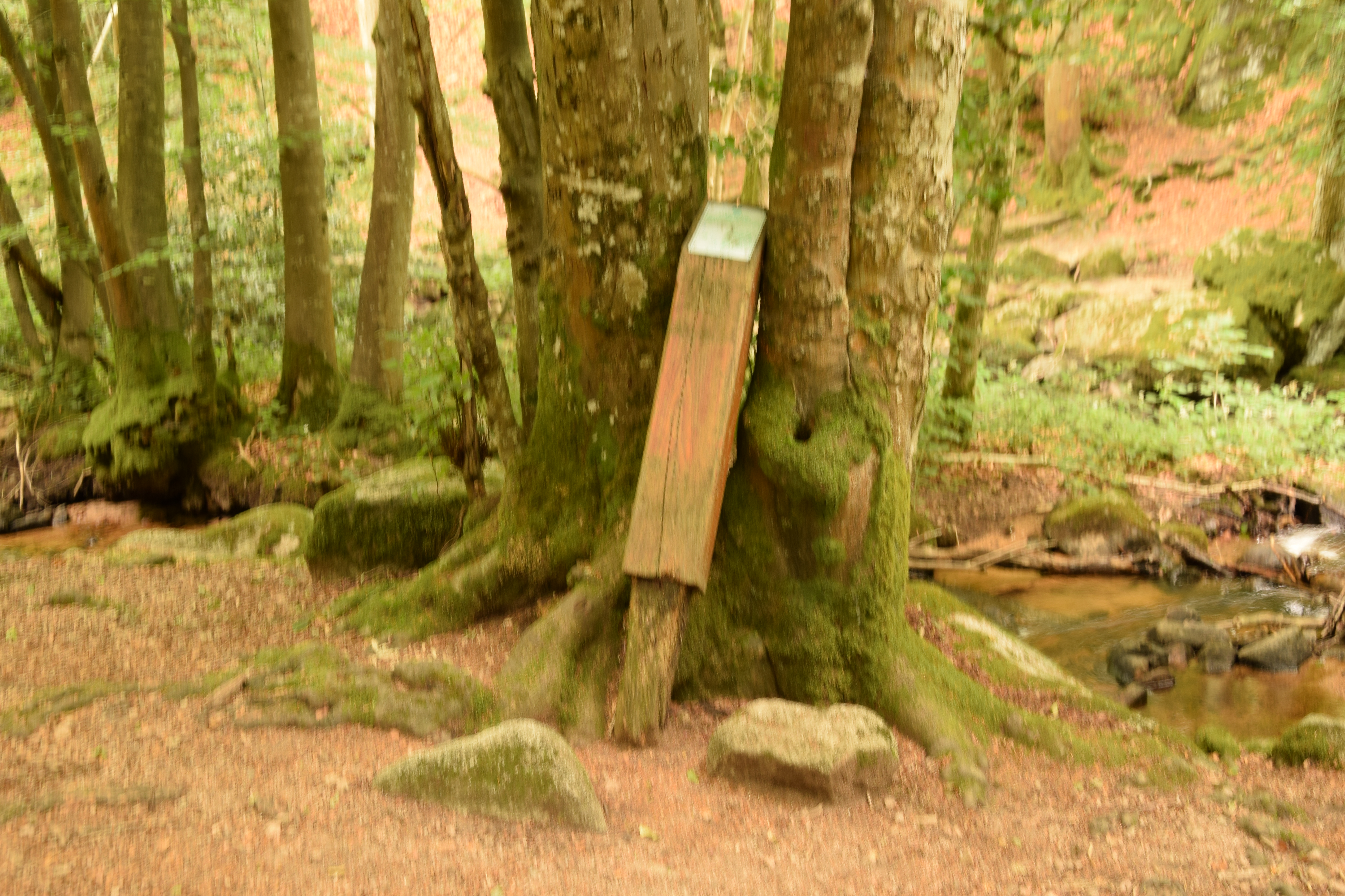 La pancarte du début de la fin. Crédules, nous ne suivons pas la carte. Pourquoi faire puisque nous avons des pancartes high-tech qui nous indiquent la route à suivre ! Ce balisage de qualité nous conduit alors tout droit dans les bois, où nous descendons sur un kilomètre avant de brusquement longer la rivière du Barbenan en sens inverse de notre direction… L’échec se profile !