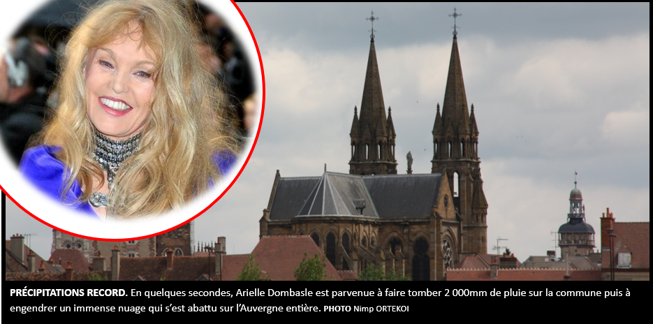 Arielle Dombasle a enchainé deux chansons, mais alors qu’elle entamait la troisième, les organisateurs lui ont demandé de s’arrêter. Un cyclone de niveau 5 était en train de se former dans le centre-ville, accompagné d’éclairs et de grêlons de la taille d’un ballon de basket. Par ailleurs, les deux chansons ont contribué à la formation d’un nuage orageux et pluvieux qui est descendu sur toute l’Auvergne. Ce dernier a permis de rafraichir les températures de 15° et à lui seul fait déborder l’Allier ou encore la Sioule. Arielle Dombasle, remerciée pour ses talents, sera, à n’en pas douter, une nouvelle fois conviée en Auvergne pour la prochaine canicule.