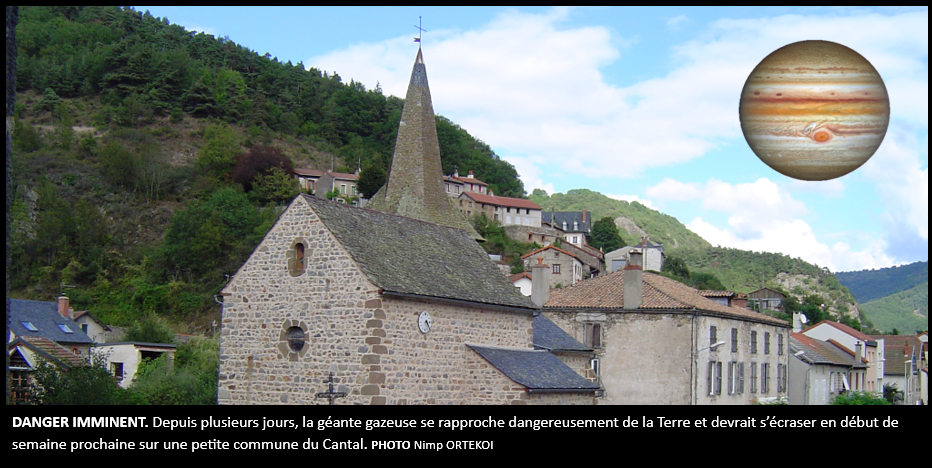 Depuis plusieurs jours, la résonance des planètes gazeuses évolue. Les géantes se rapprochent des planètes telluriques. Jupiter a ainsi vu son orbite se rapprocher du soleil et elle pourrait croiser en chemin celle de la Terre. Plus précisément, la géante gazeuse devrait s’écraser sur la commune de Ferrières-Saint-Mary, dans le Cantal, si les prévisions de la NASA s’avèrent exactes. Le cataclysme devrait être sans précédent et devrait annihiler toute forme de vie. La zone d’impact devrait d’ailleurs quelque peu dépasser la superficie de la commune. Dans tout le département du Cantal, ainsi toute la population qui pourrait être menacée d’extinction, soit trois personnes.