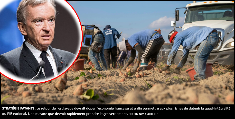 Pour relancer l’économie du pays, Bernard Arnault a fustigé la taxe Zucman : « Il ne me resterait plus que 131 milliards d’euros, une ruine… Cette taxe est une honte, un projet stalinien d’un autre temps », s’est-il indigné. Pour lui, il faut bien sûr redresser la France, mais avec d’autres leviers. Sa proposition est simple : rétablir le servage, c’est à dire une sorte d’esclavage, pour garantir une productivité exceptionnelle, engendrée par l’absence de salaires à verser. « Il faut d’abord tester le procédé vers les plus ignares, c’est à dire les bouseux d’Auvergne et du Limousin. Ils feront des tâches simples, il n’y a pas besoin de les payer. Ils pourront se nourrir de leur terre dans les montagnes, cela suffit », a-t-il déclaré.