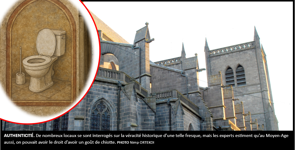 Après l’affaire des jambons secs qui sèchent dans l’édifice, la cathédrale de Saint-Flour continue à faire parler d’elle.Lors de travaux anodins de rénovations, une fresque murale représentant un cabinet et une brosse de toilette a été découverte dans la chapelle du Tombeau, à proximité de la châsse des reliques de Saint-Flour. L’évêque de Saint-Flour, Bruno Grua, a salué cette découverte extraordinaire : « C’est la première fois que l’on découvre une œuvre religieuse qui nous libère littéralement de nos impuretés. Nous ferons tout pour lui faire honneur afin de nous laver de nos péchés.