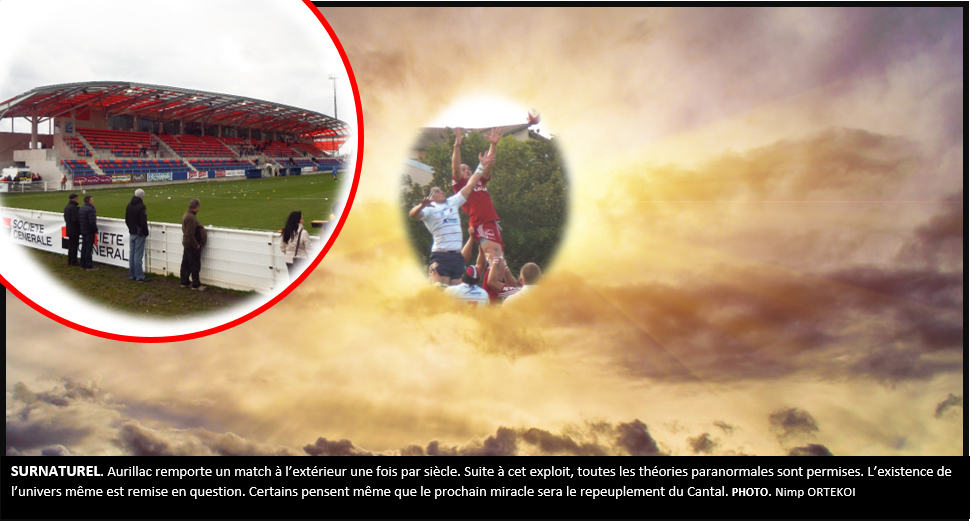 Le Stade Aurillacois a remporté hier une victoire inattendue à Biarritz (13-19). C’est la première fois depuis 74 ans que l’équipe de rugby remporte un match en dehors de ses bases. La dernière fois, il s’agissait d’une victoire contre La Voulte (0-3). Les joueurs et le staff n’ont eux-mêmes pas compris ce qu’il se passait. Les observateurs et les scientifiques, présents sur place, n’ont pas hésité à parler de phénomène paranormal qui défiait les principales mêmes de la physique. « Après une victoire d’Aurillac à l’extérieur, toutes les cartes sont rebattues, même l’existence d’une Terre plate », a par exemple réagi l’astrophysicien Jean-Pierre Luminet.
