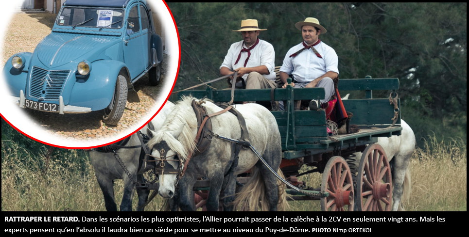 Alors que l’UE interdira les voitures thermiques en 2035, elle fait volte-face pour le seul département de l’Allier. En effet, elle considère que ce territoire reste le plus en retard de l’Union et doit à minima se développer. Dans un premier temps, la commission tolérera l’usage de la voiture thermique, faute d’électricité, puis elle espère un passage progressif à l’électrique d’ici 2135, même si les experts demeurent perplexes. Jusqu’ici, les Bourbonnais, surtout dans la montagne, se déplaçaient à pied ou en calèche, et n’avaient aucune connaissance du monde extérieur, pratiquement à l’instar du Cantal, qui est néanmoins plus civilisé car chauvinement auvergnat et capable de faire cuire des pommes de terre. Avec les aides de l’UE, ils pourraient probablement user de la 2CV dès 2045 dans les scénarios les plus optimistes.
