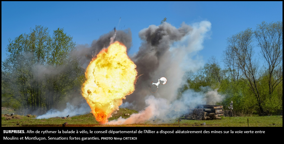 Le conseil départemental de l’Allier est en passe d’inaugurer la nouvelle voie verte entre Moulins et Montluçon. Certains tronçons sont entièrement terminées et des premiers tests concluants ont été effectués. La nouveauté de cette voie résidera dans l’installation surprise de mines antipersonnelles, afin de créer la sensation de surprises et permettre aux sportifs d’obtenir des sensations fortes. « On a installé des mines achetées à l’armée américaine, un modèle puissant qui peut désintégrer facilement un vélo ou même un petit véhicule », nous explique la conceptrice du projet, Paicy Kopate.