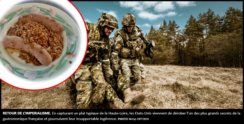 Les américains ont réalisé cette nuit une opération top secrète sur le territoire de la Haute-Loire. La CIA avait planifié la capture d’un plat de saucisse-lentille à Saugues. Plusieurs militaires ont été parachutés sur place dans la nuit. Ils ont ensuite volé un plat à Simone Grutin durant son sommeil puis exfiltré la spécialité altiligérienne en hélicoptère. Cette opération sans précédent est un véritable coup dur pour le département et pour la France, dont l’une de ses spécialités jalousement gardées a été dérobée. « Nous l’avons », a tweeté Donald Trump, photo d’un plat de saucisse-lentille ligoté à l’appui.