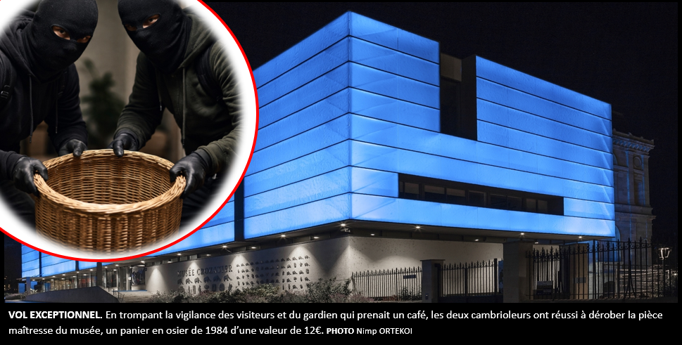 Des malfaiteurs rusés et masqués sont parvenus à entrer discrètement dans le musée Crozatier au Puy-en-Velay hier. Ils ont réussi à passer inaperçu en pénétrant dans l’enceinte avec une chaussette sur la tête et ont réussi à s’emparer d’un panier en osier en retirant un morceau de scotch. Ils ont ensuite quitté malicieusement le musée, contournant le service d’ordre, composé d’une seule personne, un gardien, qui a donné l’alerte. « J’ai vu deux individus louches. Quand l’un d’eux est passé à côté de moi, il a dit « hin hin hin », puis il s’est retiré. J’ai cru voir qu’ils possédaient un panier en osier, le joyau de notre collection. J’ai donc attendu 20min le temps de ma pause goûter puis j’ai alerté les secours », a-t-il témoigné.