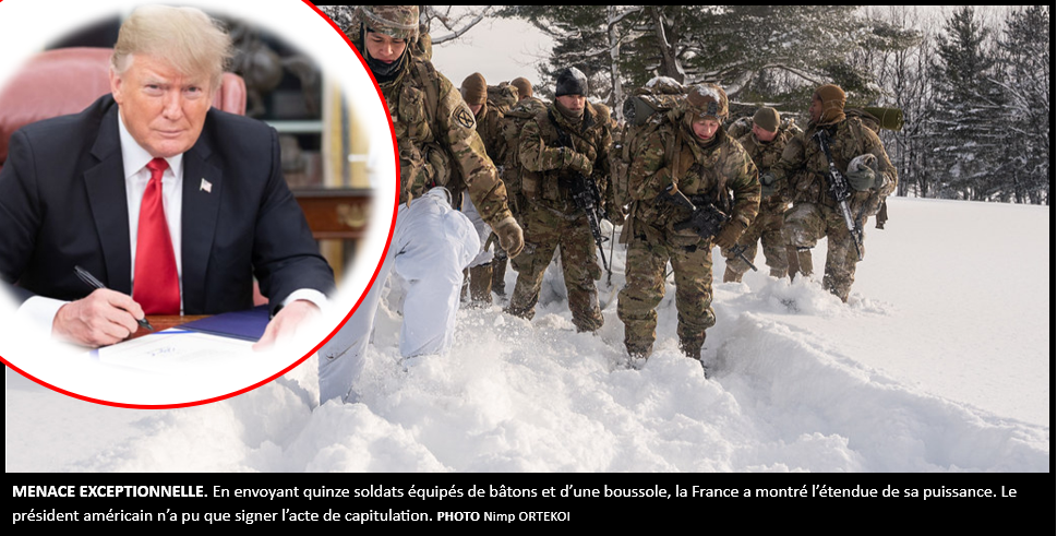 Dans un contexte tendu avec les Etats-Unis qui souhaite s’accaparer le Groenland, la France a réagi énergiquement en envoyant quinze soldats français sur l’inlandsis. Cette démonstration de toute la puissance militaire française a fortement impressionné le président américain qui a rapidement signé un acte de capitulation. Il a même dissous toutes les armées américaines et présenté sa démission. Peu avant, le président français Emmanuel Macron avait accentué les menaces et mis la pression sur les Américains : « Nos soldats sont équipés de bâtons et d’une boussole. Ils sont très méchants », avait-il précisé, avant d’annoncer également un embargo de la France sur les donuts.