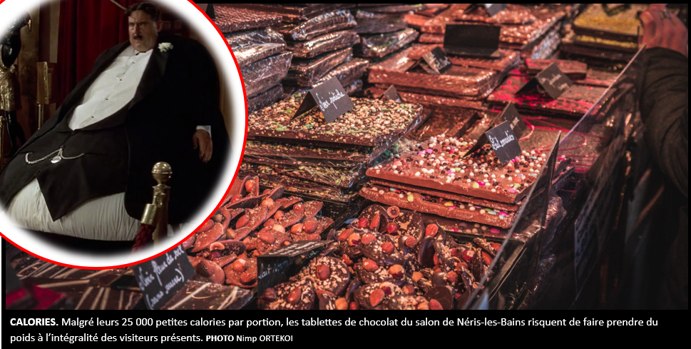 La commune de Néris-les-Bains, dans l’Allier, est d’ordinaire connue pour sa station thermale et son isolement tranquille, qui permet aux retraités de réaliser un régime pour leurs vieux jours. Mais ce week-end se tient le salon du chocolat, une parenthèse qui permet à chacun de reprendre en un seul jour jusqu’à 20kg d’acides gras saturés. Les efforts sont généralement anéantis en quelques stands grâces aux bouchés de chocolat blanc, lait ou noir, aux truffes, aux mendiants ou encore aux des figurines chocolatés titrant à 2000 kcal par portion.