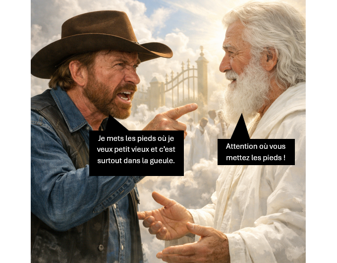 Chuck Norris ne meurt jamais. Arrivé par surprise au paradis hier, le héros américain en a profité pour virer le vieillard qui tenait maladroitement les lieux depuis des années. Chuck Norris s’est rapidement autoproclamé Dieu et a pu ainsi se ressusciter. De retour aux Etats-Unis, Chuck Norris en a profité pour rappeler qu’il était immortel puis a rétabli la paix mondiale à l’aide d’un lance-roquette. Il en a profité également pour rappeler que Dieu était un looser et que maintenant il déciderait de l’avenir de chacun en séparant les terroristes des véritables patriotes, reconnaissables à l’aide de leurs casquettes et de leurs hamburgers.