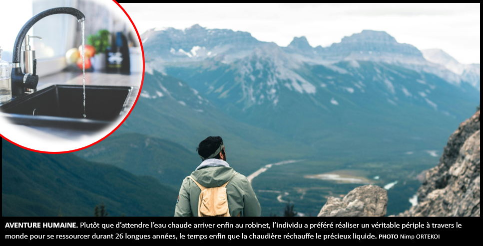 A Langeac, en Haute-Loire, un homme d’une trentaine d’années se lassait de devoir attendre venir l’eau chaude à son robinet. Plutôt que de perdre son temps, celui-ci a laissé l’eau coulé et a entamé spontanément un tour du monde exceptionnel à pied sur une durée de 26 ans. « Je voulais attendre en faisant quelque chose de cohérent, qui avait du sens et qui me permettait de vivre une aventure », nous explique-t-il. Après avoir traversé l’Atlantique à la nage ou encore traversé l’Himalaya, l’homme a risqué sa vie à chaque instant. Il a plusieurs fois été arrêté et a même échappé à une exécution sommaire.