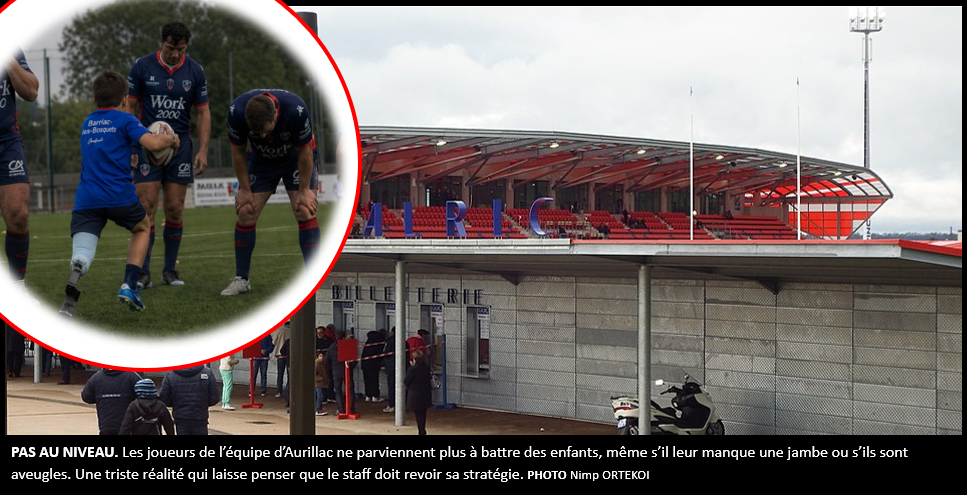 Le stade aurillacois a traversé une mauvaise passe en avril avec plus de 200 points encaissés lors de la compétition de rugby de ProD2. Mais la spirale infernale ne semble pas s’arrêter. Pire encore, les joueurs d’Aurillac se sont inclinés lourdement aujourd’hui à l’entrainement 107 – 3 (mi-temps 55-0) contre une équipe de cinq poussins unijambistes de Barriac-les-Bosquets, à proximité de Mauriac. « Ils n’avaient même pas l’équipe au complet. J’ai honte. J’ai envie de me cacher le plus loin possible, ce n’est pas possible », a réagi avec émoi l’entraineur Roméo Gontinéac.